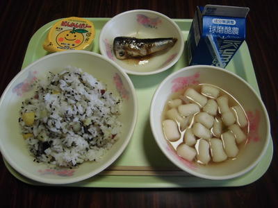 メニュー くりいもごはん、はんぺん汁、いわしのおかか煮、ばんかんゼリー、牛乳