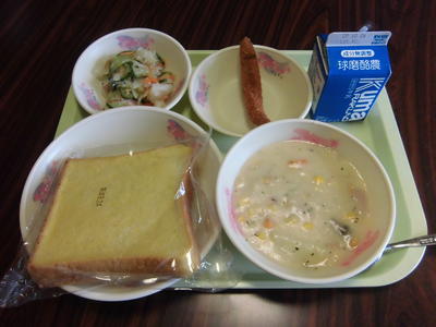 今日は、洋風の給食です。コーンクリームシチューは、具だくさんで食べやすく好きな児童も多いようです。