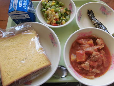 先週のかぼちゃパンに続き、今日は、人参パンです。鶏肉のトマト煮との相性もいいですね。ししゃもも香草を付けて焼いてあり、洋風になっていたかな?コロコロサラダは、食べやすいですね。