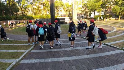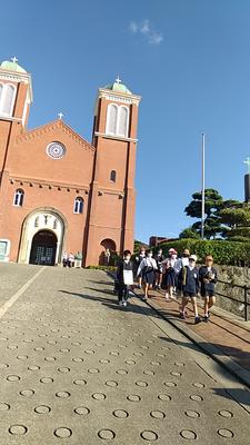 4つの班に分かれてのフィールドワークでは、平和ボランティアの方に案内していただきました。平和公園、浦上天主堂、如己堂、原爆落下中心地等を巡って、最後に原爆資料館で学習しました。