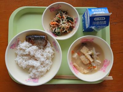 メニュー 麦ごはん、サンマのみぞれ煮、秋野菜のみそ汁、ごま和え、牛乳