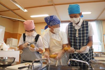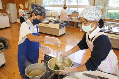 10月14日(水)、5年生家庭科の調理実習の様子です。コロナ感染対策で学級を2班に分け、ポリエチレンの手袋を着けての作業で少しやりにくかったようですが、「ほうれんそうのおひたし、ゆでいも、ゆで卵」をつくりました。どれもおいしかったです。