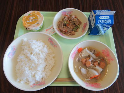 メニュー きのこごはん、豚汁、梨ゼリー、牛乳