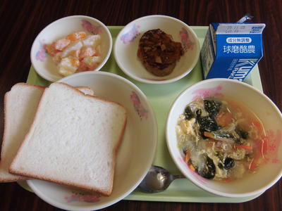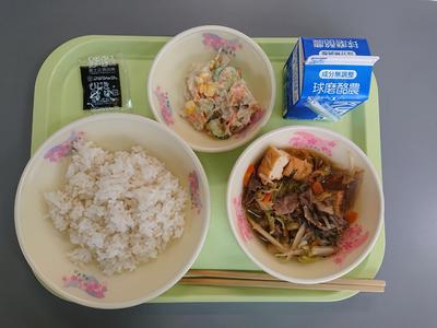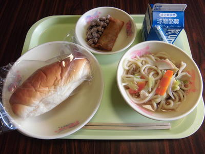 メニュー ミルクパン、チョコタフィー、水俣ちゃんぽん、春巻き、牛乳
