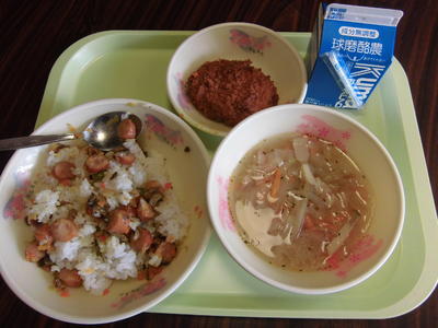 メニュー カレーピラフ、野菜スープ、コロッケ、牛乳