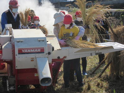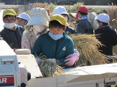 10月27日(火)、約2週間かけ干しして乾燥させた稲を予定通り脱穀しました。平日にもかかわらず、お手伝いいただいた溝口さんや保護者の方、本当にありがとうございました。今年度はコメ袋に2袋と少し収穫することができました。(約65㎏分です!)11月14日(土)の土曜授業で、新米会を行う予定です。自分たちの手で育てたお米を鍋で炊いて食べるのをみんな楽しみにしています♪