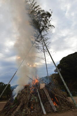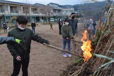地域の方や保護者の皆さんも、正月飾りやお札などを持ち寄られ、火は勢いよく燃え上がり、参加者の願いを載せた煙が空高く昇っていきました。
