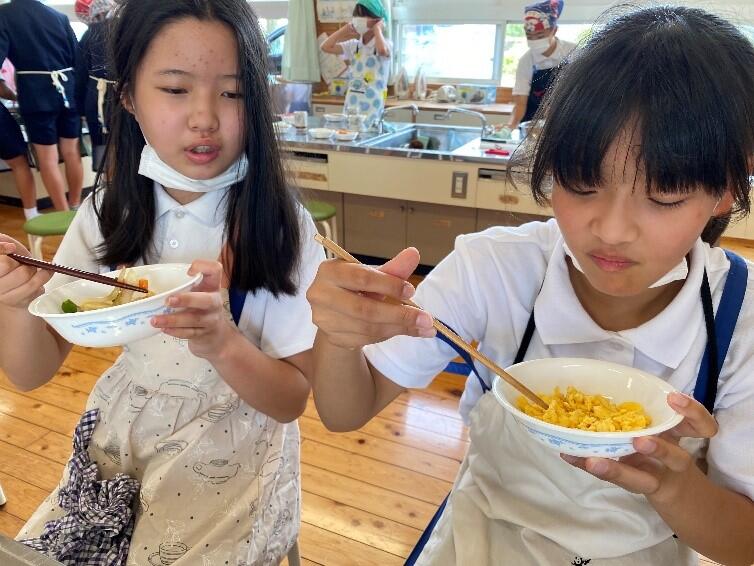 「炒める」調理法の学習で、「いろどり野菜炒め」と「スクランブルエッグ」を作りました。各班で計画、役割を分担し、協力して調理することができました。子供たちの力だけで作った料理。とってもおいしかったようです。このあと、給食もしっかりといただきました!進んで勉強することができた調理実習となりました。