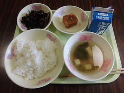 メニュー: ひじきごはん、すまし汁、みそ田楽、牛乳