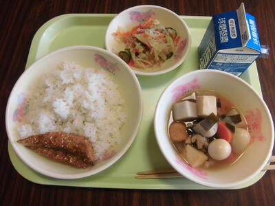 メニュー:もち麦ごはん、かしわ汁、太刀魚のデコポン南蛮漬け、手作りふりかけ、牛乳