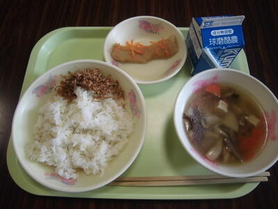 今日は、水俣市いきいき健康食育の日メニューです。水俣・芦北地域の海の幸、山の幸を同時に味わえるメニューです。ちりめんを使った手作りふりかけもおいしくて児童も喜んで食べていました。