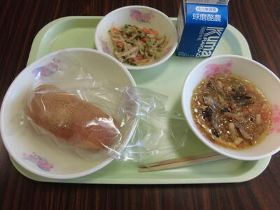 バンバンジーは、漢字で書くと「棒棒鶏」です。蒸した鶏肉を棒でたたいて柔らかくしてつくるためにこのような名前がついたようです。タンタン麺と同じ中華料理ですが、どちらもよく食べられるようになりましたね。黄粉揚げパンは、児童が好きなパンです。