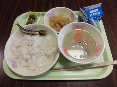 今週は、給食週間です。1日目のメニューは、「給食の始まりメニュー」です。明治22年に山形県で弁当を持ってこられない児童に、「おにぎり、焼き魚、漬物」を出したのが始まりだと言われています。今日は、めざしとたくあんを使ったおかずでした。