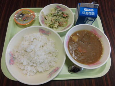 メニュー:麦ごはん、サラ玉カレー、ごまじゃこサラダ、みかんゼリー