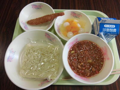 メニュー:黄粉揚げパン、春雨タンタン麺、バンバンジーサラダ、牛乳
