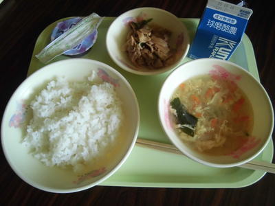 メニュー ごはん、野菜の中華スープ、ぶどうゼリー、こんにゃくロースー、牛乳