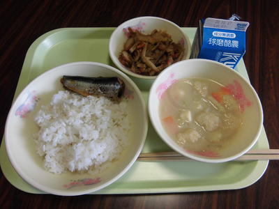 メニュー 麦ごはん、いわしのかぼすレモン煮、豆乳味噌汁、干したけのこのきんぴら、牛乳