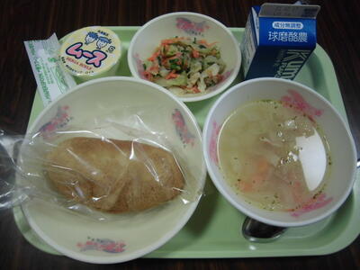 メニュー:揚げパン、野菜たっぷりスープ、ツナサラダ、ムース、牛乳