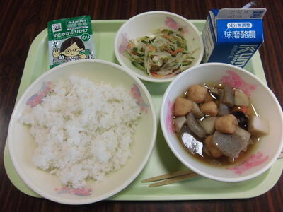 メニュー:麦ごはん、筑前煮、ごま酢和え、のりふりかけ、牛乳