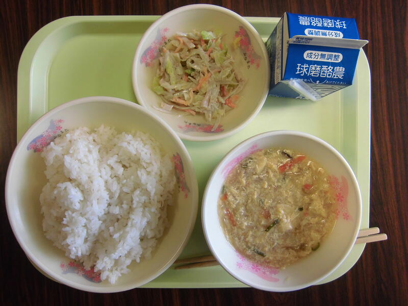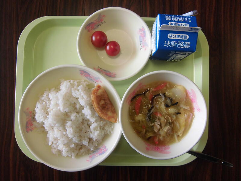 メニュー:麦ごはん、中華丼の具、肥後餃子、ミニトマト、牛乳