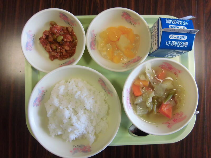 子供たちは、ごはんと具を自分で混ぜて自分なりのチキンライスにして、おいしそうに食べていました。マッシュルームなども入っていて、とてもおいしかったです。フルーツゼリー和えは、大好きな子供が多く、おかわりに行列ができていました。