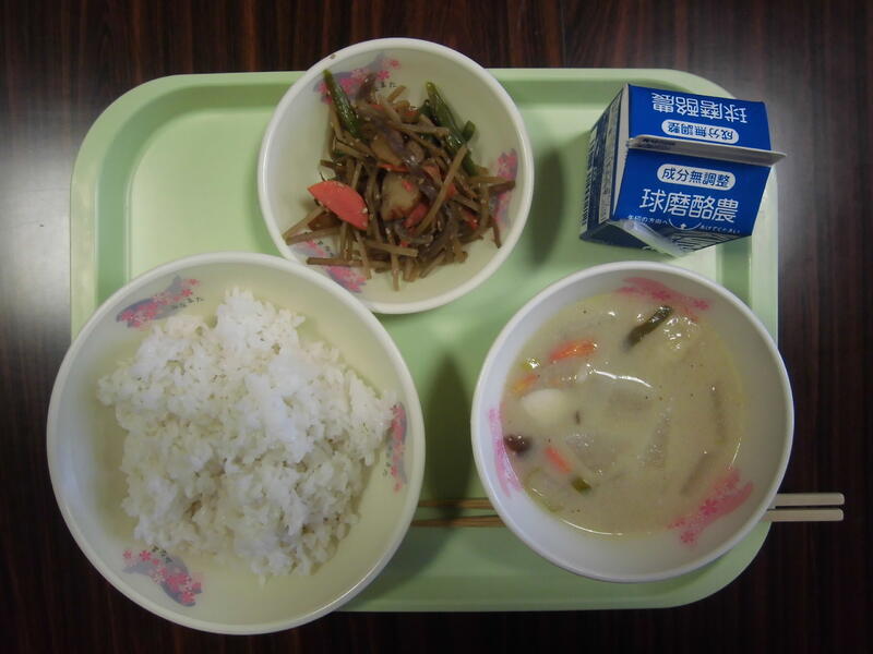 メニュー:麦ごはん、武光公鍋、ごぼうのきんぴら、牛乳