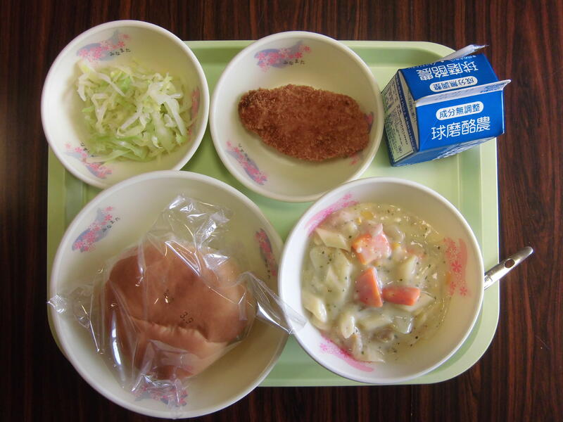 メニュー:ドッグパン、チリコンカン、ベーコンと野菜のスープ、みなまたサラダ、牛乳