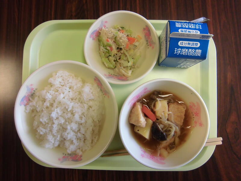 子供たちは、ひじきごはんの具をごはんにしっかり混ぜて、「おいしい」と言って、食べていました。お代わりをする子供もたくさんいたようです。揚げだし豆腐も、出汁がしみ込んだ大根おろしのたれがたっぷりかけられていて、とてもおいしかったです。