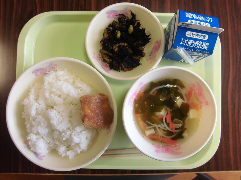 メニュー:ひじきごはん(ごはん、ひじきごはんの具)、すまし汁、揚げだし豆腐、牛乳