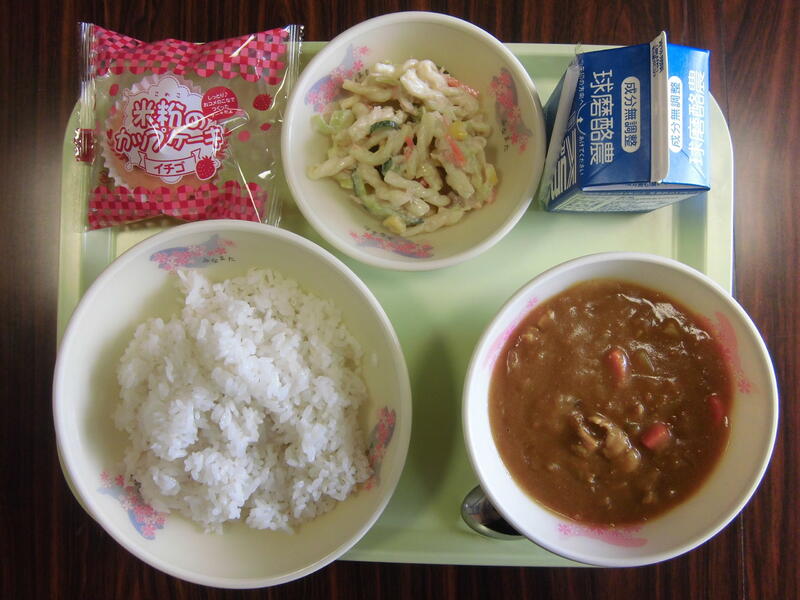 今日は、子供たちに大人気のカレーに、お祝いデザートで、カップケーキがありました。今日のサラたまカレーは、2種類のカレールウ、カレー粉、香辛料も使って作ってあるそうです。子供たちも大喜びで食べていました。カップケーキもとてもしっとりしていて、おいしかったです。