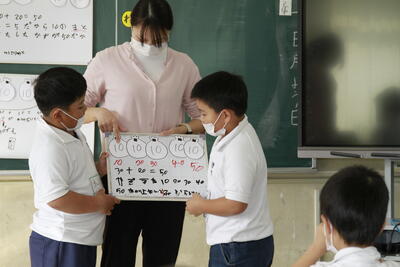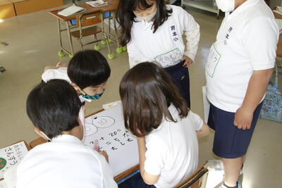 1年生の教室で算数の学習を除くと、足し算の学習が行われていました。30+20の計算は、10のまとまりがいくつあるかを使って計算すると良いということを学びました。練習問題では少し難しい計算にチャレンジしていました。