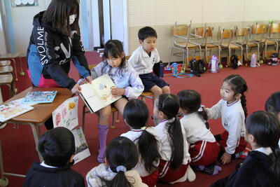 朝から教室で読み聞かせが行われていました。物語の世界に入り込み、身を乗り出して聴いている様子でした。