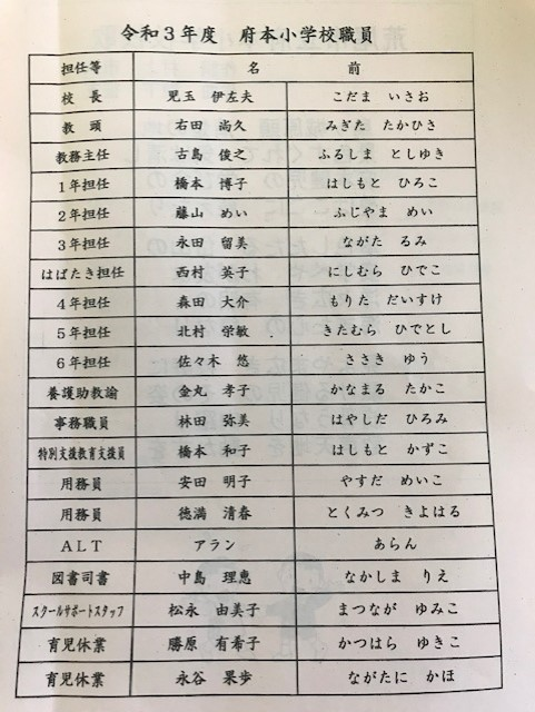 それでは、1年間お世話になる、府本小の先生方を紹介します。職員名簿R3.png