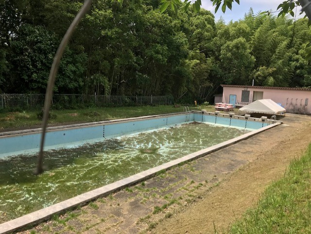 樹木に囲まれたプールには雑草が茂り、水面には枯れ枝があふれ、泥がいさっていました。プール掃除開始.png