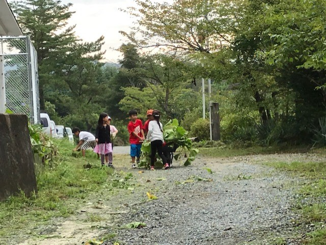 府本小は、自然豊かなだけに草木が生い茂っています。学校が始まる前に除草作業ができてよかったです。長雨でぬかるんだところもあります。けがのないように気をつけて、よろしくお願いします。