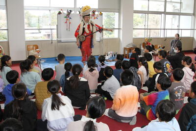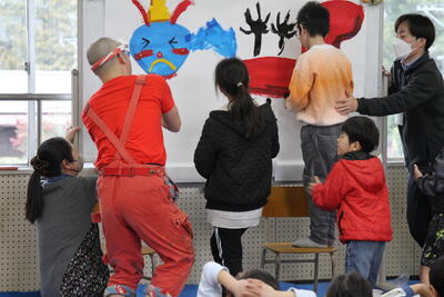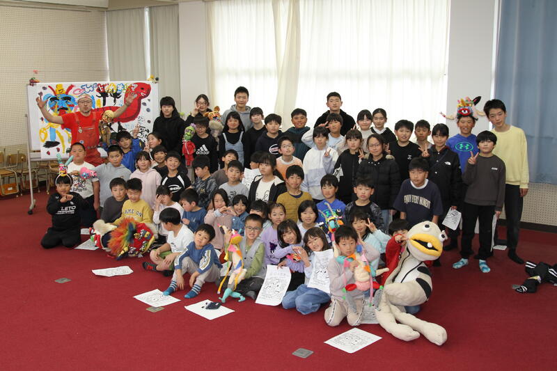5・6時間目に、絵本作家よしながこうたく先生の「お絵描きワークショップ」がありました。よしなが先生は絵本「給食番長」を描いた先生です。府本小学校の図書室にもあります。そんなよしなが先生と子ども達が協力して、「ぴどあきらマン」という架空のキャラクターを描きました。始まりからおしまいまで、子ども達の笑顔と笑い声が絶えないワークショップとなりました。