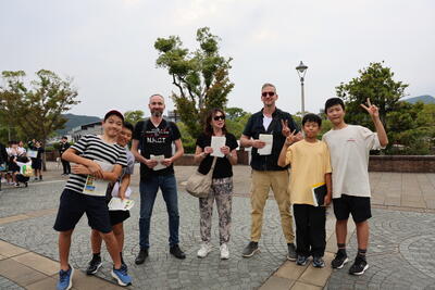 フィールドワークでは、積極的に海外からのお客様に話しかけたり、荒尾のPR新聞を配ったりして交流していました。