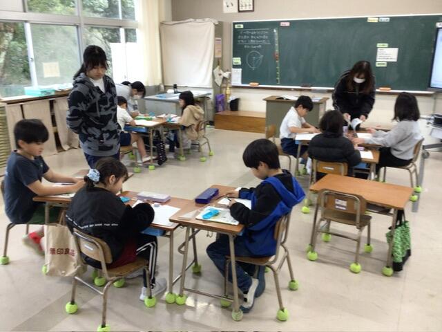 給食前に、1・2年生が猿山から学びの森にかけて何かを探しています。聞いてみると、「どんぐり」と「まつぼっくり」を探していたのでした。これから何か作るのかな?そんなことを考えながらの秋の一コマでした。