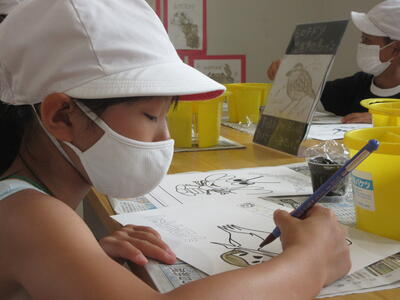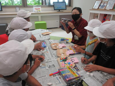 館内で荒尾干潟について学習した後、潟どろで塗り絵をしたり、貝殻にお絵かきをしたりしました。