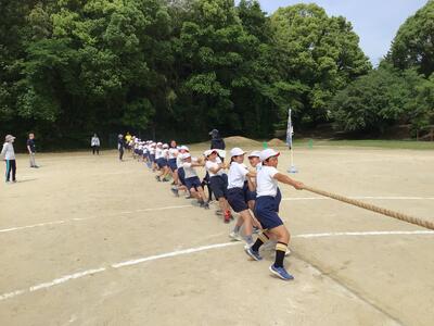 次に、綱引きの練習をしました。試しに綱を引いたところ、初日は白組が全勝…。この後、赤組がどんな作戦を立てて盛り返していくか楽しみです。