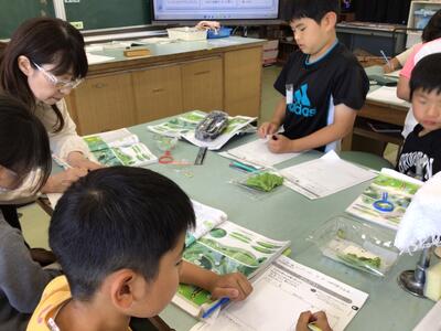 3年生は理科の時間。アオムシを観察して絵に表していました。