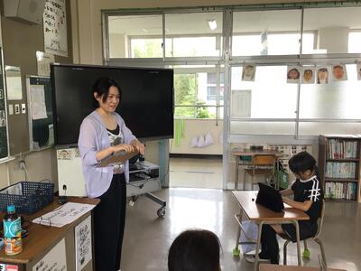 4年生が福祉学習の一環で、人工内耳を利用することについて学習しました。講師の先生は保護者の方。動画資料などを使って、子どもたちに分かりやすく教えていただきました。