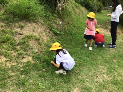 1年生は生活科の時間に夏の生き物探しをしていました。子どもたちの大好きなバッタやダンゴムシを見つけて大喜び。このあと、教室で生き物を飼ってみる予定です。虫が苦手な担任はちょっとドキドキしているようですが、みんながしっかりお世話をしてくれると思います。