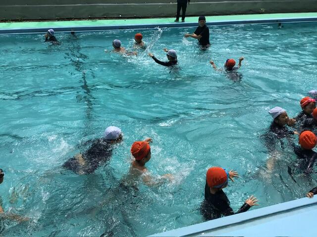 3時間目に低学年がプールの授業でした。少し遅れて見にいくと、少ない人数ながら、みんなで渦巻きを作っていました。少しずつ流れができたところで先生から「反対まわり〜」と言われて「キャーキャー」言いながら、楽しんでいました。昨日は少し気温が低かったですが、今日は蒸し暑さもありとても気持ちよさそうでした!