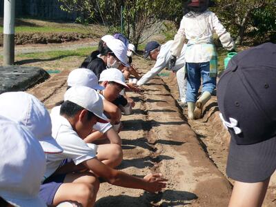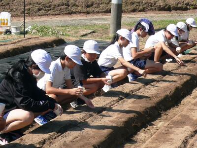 先週の金曜日から6年生の本物体験(野菜作り)がスタートしました。3年生が大豆を育てている畑のところに山崎様と境野様が畝を準備してくださり、前回話し合いで決定した野菜の種や苗を植えていきました。山崎様の奥様もお手伝いしてくださり、丁寧に植えていきました。これから度々お世話や様子見のために訪れていくことになります。大きく生長してくれることを楽しみにしています!