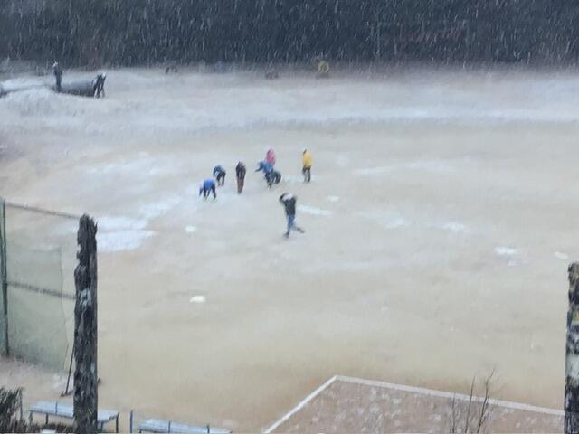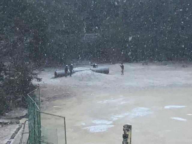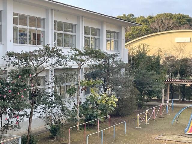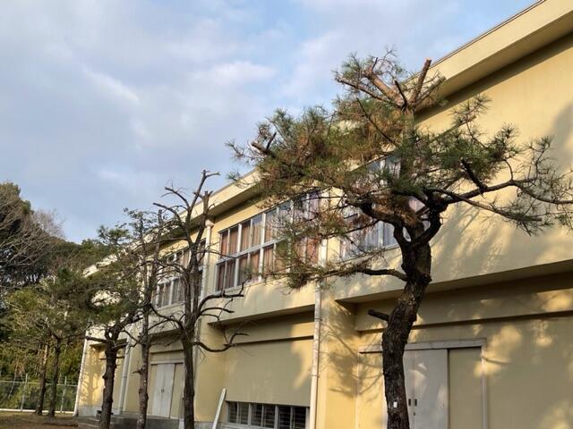 荒尾市教育委員会から樹木伐採の予算をつけていただき、土曜日に実施していただきました。職員駐車場のところの桜の木は枯れて枝が落ちてきており、いつ車に直撃するかヒヤヒヤしていましたが、ばっさり切っていただきました。また、体育館周辺や中庭の木は大きくて葉が雨樋に詰まっていましたので短く剪定していただきました。おかげでスッキリしました。ありがとうございました!