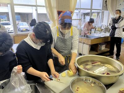 地域の方々に教えていただき、材料を切ったり、煮込んだりしていました。