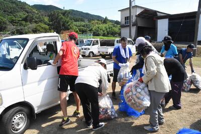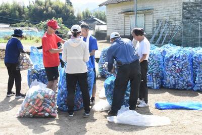 保護者の皆様が集めてきてくださった資源を、学校で小中の職員と中学生と