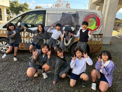 御船恐竜博物館の車にも大興奮。写真撮影していました。