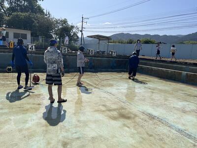 保護者の皆様の力で、1年間使っていないプールがみるみるうちにきれいになりました。